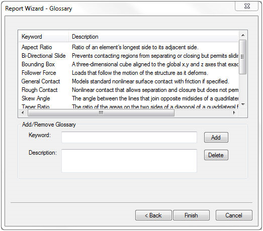 - Fare clic su Avanti > nelle finestre di dialogo a comparsa all'interno della procedura guidata finché non viene visualizzata la finestra Creazione guidata rapporti - Glossario, quindi fare clic su Fine per generare il rapporto.