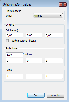 - Per spostare la posizione del modello, nella finestra di dialogo Unità e trasformazione, nell'area Origine, immettere valori per l'asse X, Y e Z.
