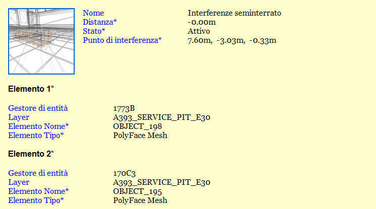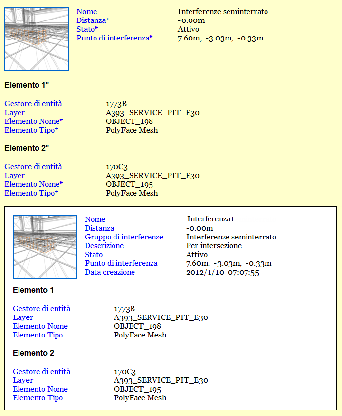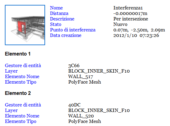 - HTML (tabulare): crea un file HTML tabulare contenente tutte le interferenze e un file JPEG con i relativi fermi immagine e i dettagli corrispondenti. Se si sceglie questa opzione, è necessario selezionare o creare una cartella per i file e immettere un nome per il file HTML. I file HTML in formato tabella possono essere aperti e modificati in Microsoft Excel 2007 e versioni successive.