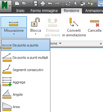 Gli strumenti di misurazione consentono di misurare la distanza tra i punti sugli elementi nel modello. Tutte le misurazioni vengono eseguite in unità di visualizzazione. Gli strumenti di misurazione sono disponibili nella scheda Revisione gruppo