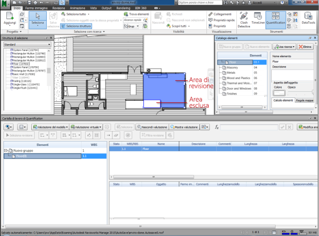 La funzionalità Area esclusa consente di ritagliare elementi della geometria. Disegnando un'area esclusa, si esclude una parte della valutazione ad area esistente. Le aree escluse risultano ad esempio utili quando si contrassegna l'area del pavimento per la valutazione, ma si desidera escludere dalla valutazione una sezione di tale area, come un corridoio. L'area esclusa del corridoio viene quindi "sottratta" dall'area del pavimento nella cartella di lavoro di Quantification.
