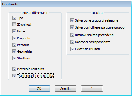 Salva ogni differenza come gruppo. Salva le differenze trovate nel confronto tra i due elementi come gruppo di selezione per analisi successive. Al gruppo di selezione è inoltre associato un commento con informazioni più dettagliate sulle differenze.