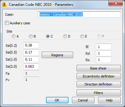 Parameters of a structure seismic analysis depend on a seismic code used during calculations of a structure influenced by seismic loads. Select Canadian seismic code NBC 2010 in the New Case Definition dialog or click Parameters in the Analysis Type dialog.