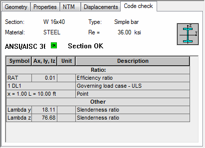 Click the Code check tab in the Bar Properties dialog for a steel, aluminum, or timber member to display the following: