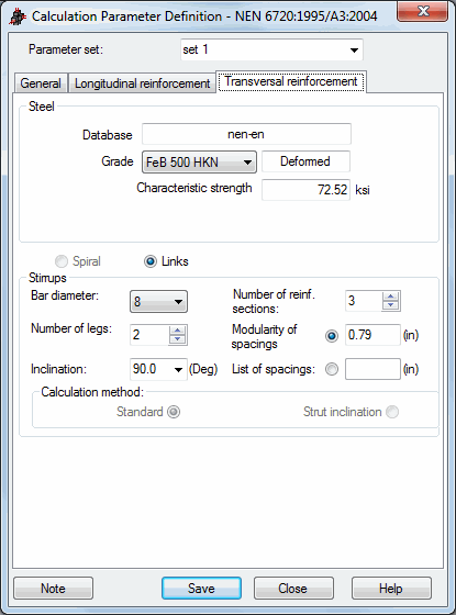 - Inclination, that is the angle between longitudinal and transversal reinforcement; a list of choice contains the following angle values: 90, 65,5 and 45 degrees.
