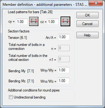 - section factors (for a section in bending): the ratios Wny/Wy and Wnz/Wz - the option is used to define the ratio of the net section modulus (for a section including bolt openings) to the gross section modulus. The factors are considered in the calculations during verification of the member section ratio according to point 7 of the code.