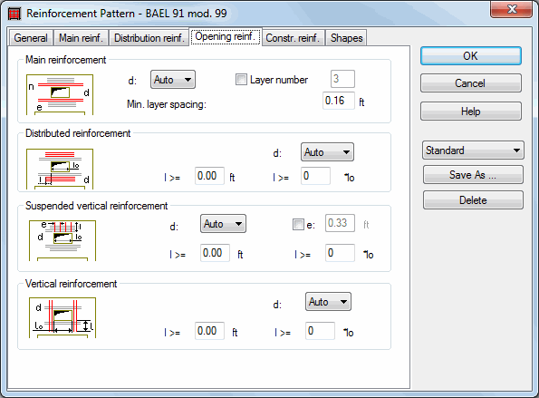 This reinforcement appears both in the upper and the lower part of an opening and serves as the bowstring that assures correct work of the created vaulting. The available options define the reinforcement diameter, the number of reinforcement layers and the minimum spacing between reinforcement layers. If no reinforcement diameter is selected, it is set automatically.