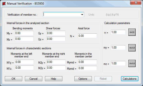 The Manual Verification dialog provides steel member verification against force values defined according to the British steel code BS5950. Access the option by clicking Design