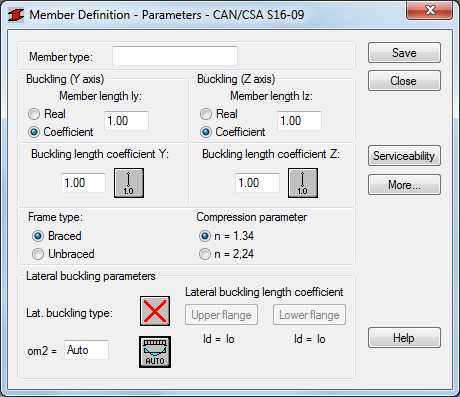 The Member Type field displays the name of the selected member type (enter any member type name). The Buckling Y axis and Z axis fields display the length of a member for the required plane. There are two ways to define this length:
