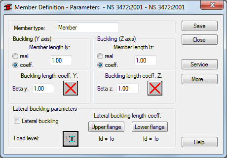 Pressing the More button opens an additional dialog box for definition of the remaining member type parameters provided in the code such as: equivalent moment coefficients, section parameters, etc.