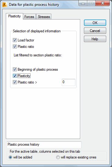 Select the Plasticity tab in the Table Columns dialog to select plasticity quantities for presentation.