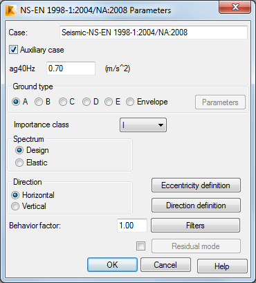 Parameters of a structure seismic analysis depend on a seismic code used during calculations of a structure influenced by seismic impact. Select the seismic code NS-EN 1998-1:2004/NA:2008 in the New Case Definition dialog or click Parameters in the Analysis Types dialog.