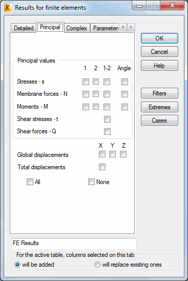 If you select s1, s2 or s12, it adds columns for stress values s1, s2 or s12, respectively, for individual planar FEs in the main coordinate system as selected during structure analysis.
