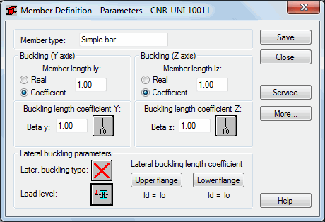 In the Lateral Buckling Parameter field select options used during the verification of the lateral buckling for the member: lateral buckling type, load level and the lateral buckling length coefficient. Clicking the appropriate icon opens the dialog for the definition of corresponding parameters.