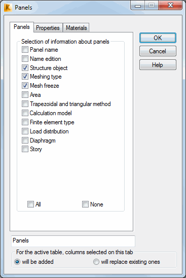Use the Panels dialog to select the information about panels which display in the table.