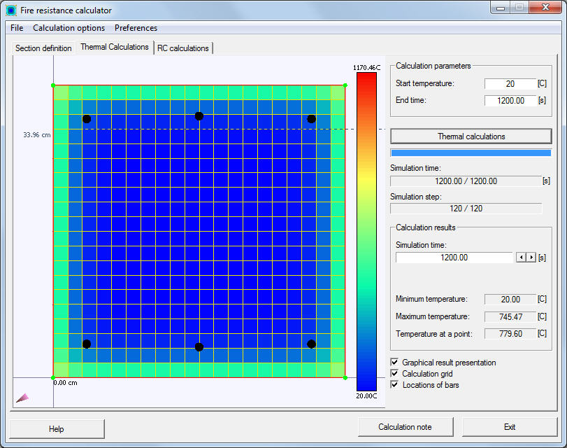 Click Calculations to start thermal calculations for a section. The calculation process is represented graphically in the cross section of an RC element (Graphical result presentation must be selected). Progress is represented by the progress bar and changing values of the simulation time and simulation step (see Parameters of thermal calculations).