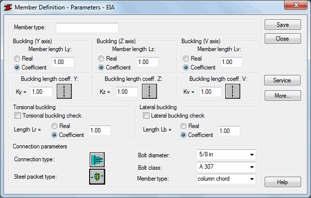 Use this dialog to define member type parameters for the American steel code EIA (Design of Steel Transmission Towers). There are two ways to access this dialog:
