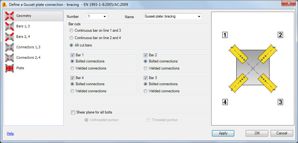 Use the Geometry tab to define basic parameters of the gusset plate. Specify: