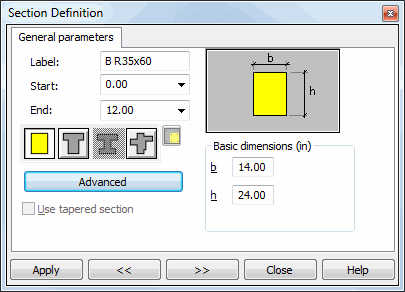 Once the Use Tapered Section option is active, a linearly varying cross section type can be assigned by entering the value of the height of the right edge of the selected segment in the h2 field. Note: for the left cantilever, h2 corresponds to the left edge of the segment.