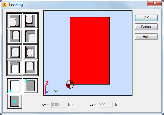 Once the segment is selected and the Leveling button is pressed, the Leveling dialog box will appear on the screen (see the figure below). It aids in setting the segment location by using characteristic section points (e.g. colinearity with regard to the right upper corner of the section). Otherwise, section leveling can be set by entering the segment displacements with regard to 'dy' and 'dz'. The leveling reference point can be set arbitrarily. The segment can be leveled in two directions: Y and Z. The 'dy' and 'dz' fields show the displacement increment for the characteristic points in relation to the reference point. Changing the reference point results in automatic recalculation of 'dz' by 'dy'. The section displayed in gray corresponds to the selected segment, while the yellow section stands for the adjoining segment (the reference segment for leveling).