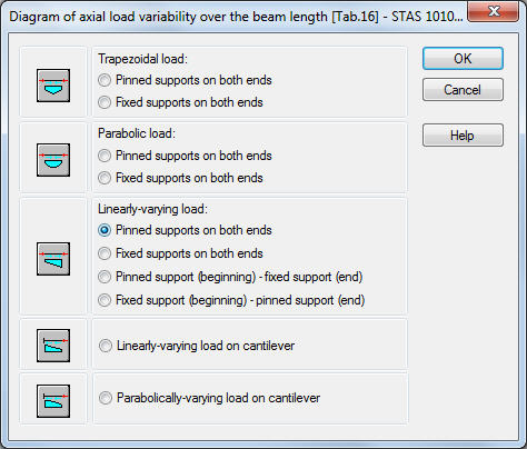 In the dialog box the user should choose one of the patterns of loading and fixing the member under analysis. The program will automatically determine values of compressive forces at the characteristic points on the member and will define the appropriate buckling lengths according to the formulas specified in Table 16. Take note that the pattern of fixing a member should be compatible to the buckling pattern defined in the Buckling Types dialog box. Otherwise, the program will not take account of the influence of the compressive force variability. For example, for a beam with pinned supports on both ends, select one of the following icons: 1, 3 or 5 from the top of the dialog box.