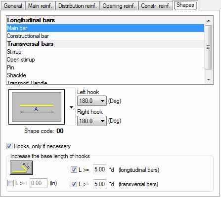 In the case of transversal bars, the shape of the stirrup or pin is selected by default. Similarly, the shape (ending) of the longitudinal bars is selected, differentiating between the main bars and the structural bars. It is possible to select a bar ending with a hook bent at any angle for each bar.