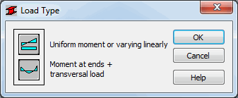 During automatic calculations, the character of the load changes together with the changes of load case. For automatic calculations, the default option is Constant Moment, Linearly. After a calculation case is selected manually, or the value of internal forces is defined by the user, you can exactly determine the character of the load.