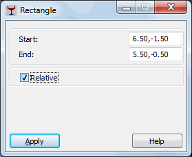 If you select Relative and then define a rectangle, coordinates of the second vertex of the rectangle are calculated with respect to the position of the first rectangle vertex. If Relative is cleared, coordinates of both rectangle vertices are given in the adopted coordinate system.