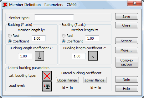 In the Lateral Buckling Parameters field select options used during the verification of the lateral buckling type: lateral buckling type, load level and the lateral buckling length coefficient. Selecting the appropriate icon opens the dialog for the definitions for corresponding parameters.