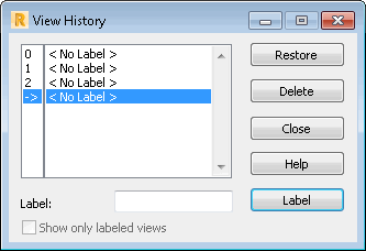 Views that result from zooming, translation, rotation, projection onto different planes, and the visualization of such structure attributes as: supports, sections, loads, and so on, are added consecutively to the list in the dialog and assigned successive numbers. To name a view, enter a label and click Label. The new name is added to the list of views. To return to the previous structure view, double click the view or select the view from the list and click Restore.