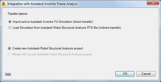 - Import active Autodesk Inventor FA Simulation (direct transfer) - creates calculation model directly in the Robot on the base of the current Simulation in the FA module. The option is not available if the Autodesk Inventor is not installed.