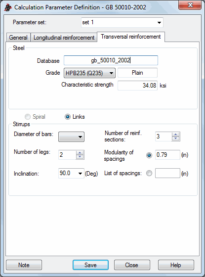 The Transversal reinforcement tab of the Calculation Parameter Definition dialog box for the Chinese code GB 50010-2002: