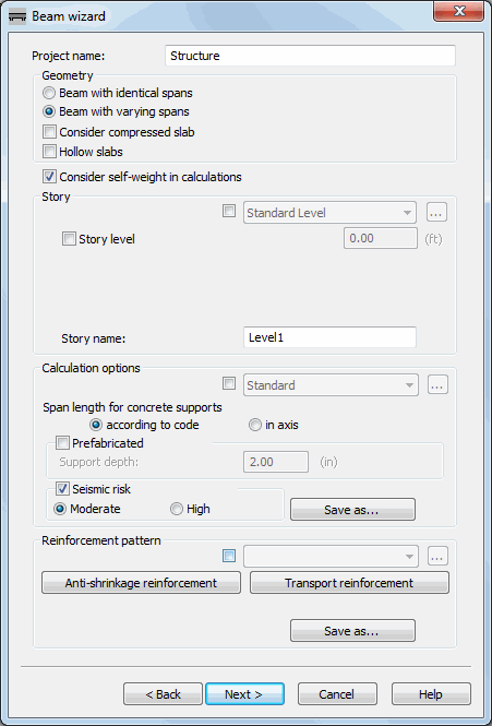 if the option enabling selection of a file from the selection list with files containing reinforcement parameters is switched off, then the remaining options in the Reinforcement patternfield become accessible; if such a setting is chosen, then parameters defined in this field will be considered in calculations; pressing the Save as button enables saving to a file the following parameters: anti-shrinkage reinforcement (pressing this button opens an additional dialog box), transport reinforcement (pressing this button opens an additional dialog box), consideration of breaks in concreting.
