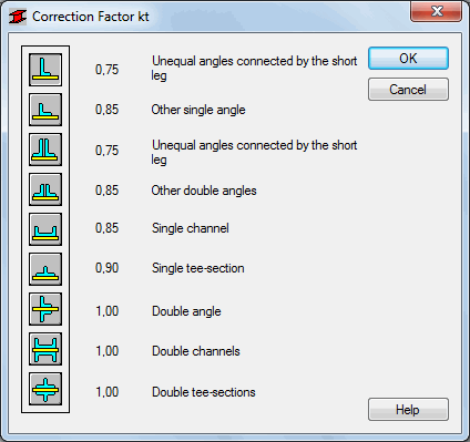 Use this option to define a value of the correction factor kt. This factor is taken into account when calculating tensile resistances of a member, as specified in Section 7.2 of the code. You can select one of the options in this dialog which coincide with the factor values in table 7.3.2 of the code.