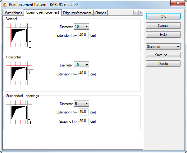 The Opening reinforcement tab allows you to define parameters of opening reinforcement for the BAEL code.