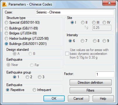 Parameters of a structure seismic analysis depend on a seismic code used during calculations of a structure influenced by seismic impact. Select seismic Chinese codes in the New Case Definition dialog or click Parameters in the Analysis Type dialog.