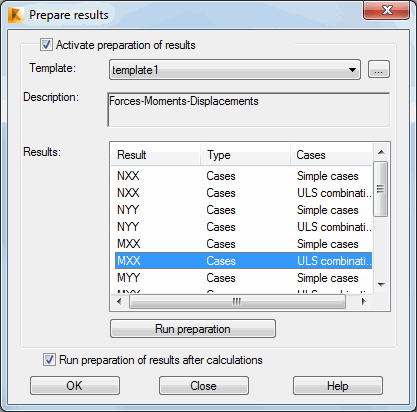 To calculate results, click Run preparation or activate the Run preparation of results after calculations option. When calculations of a structure model complete, result preparations will start automatically.