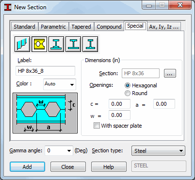The Special tab defines special sections (sections with a corrugated web, castellated sections, welded sections: SFB, IFBA, and IFBB). The following images shows the Special tab on the New Section dialog.