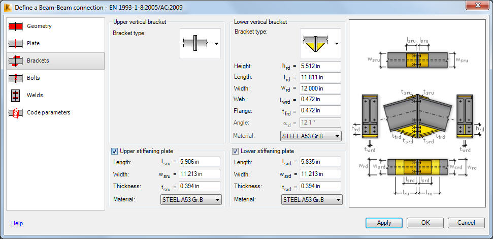 Use the Brackets tab to define different types of brackets between the beam flanges and the front plate.