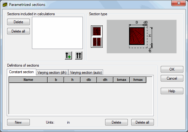 Click the Par. sections button in the Definitions dialog (Groups tab for timber sections), the following dialog displays: