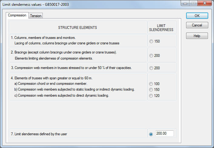 The Limit Slenderness values dialog box is used to define the limit values of slenderness for members in compression and tension. It opens on pressing the Define button in the Configuration dialog box.