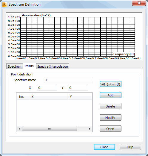 To define a new spectrum, enter the appropriate value amount in the X and Y fields. The default values have been selected in the Abscissa (X axis) and Ordinate (Y axis) fields on the Spectrum tab. Notice if the Logarithmic Scale option has not been turned on for the mentioned axes. Clicking Enter or Add enters the point of the given values to the spectrum definition.