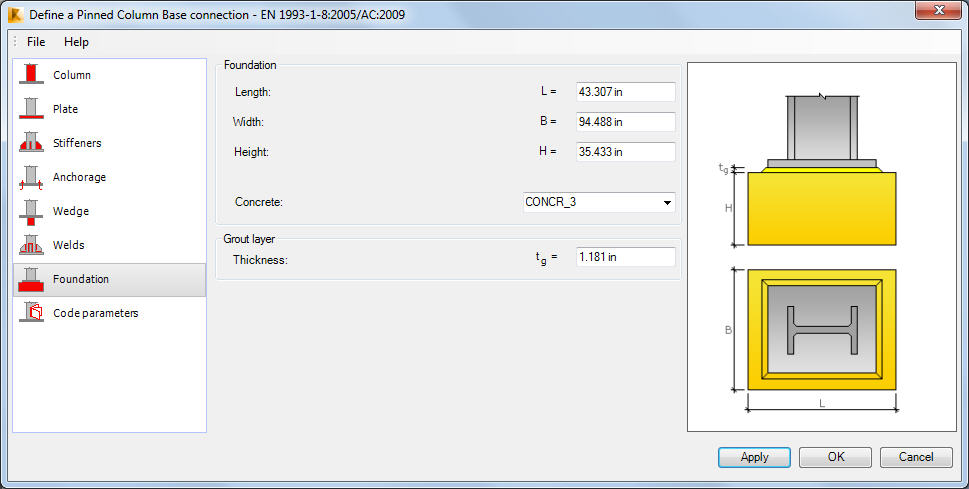 Use the Foundation tab to define basic parameters of the foundation; you can also select a concrete class for the foundation. This information is used to calculate the resistance of the column base plate for bearing pressure onto concrete. In the Grout layer field you can define parameters of a grout layer that is usually placed to correctly position the column and to ensure that the base plate is in complete contact with the foundation.