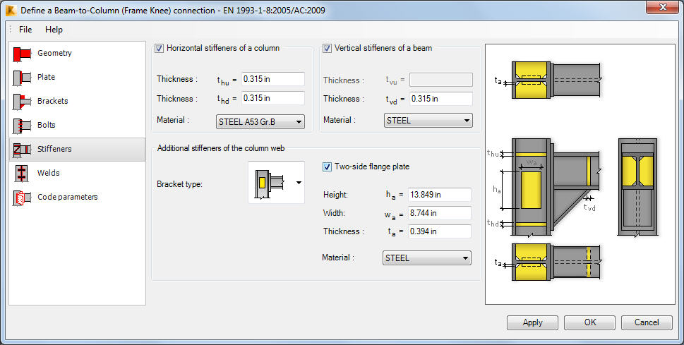 Use the Stiffeners tab to define vertical stiffeners for the beam and horizontal stiffeners for the column.