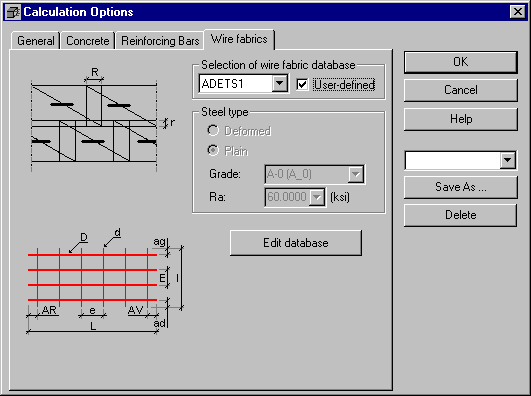 Once the Calculation options dialog box is activated for deep beams, walls or RC slabs and the Wire fabric tab is selected, the dialog box assumes the following shape.
