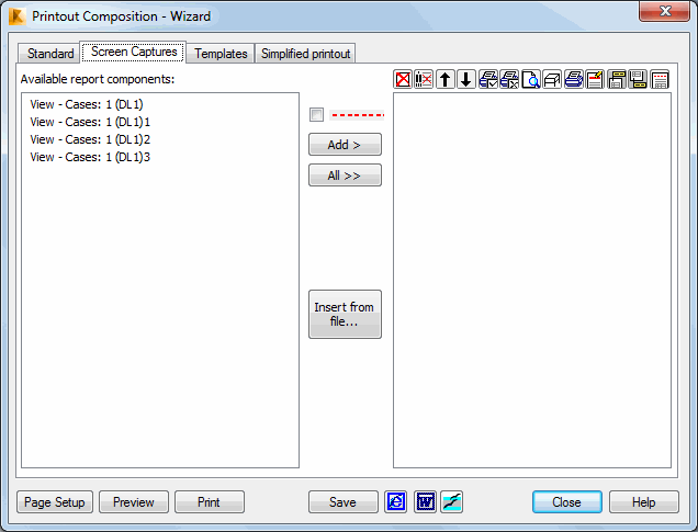The right panel composes a complete printout that may contain all the objects specified in the left panel. To prepare the printout composition, move screen captures from the left to right panels using the All and Add buttons. All moves all of the available objects to the right. Add moves only selected (highlighted) objects.