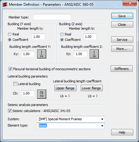 - Buckling Length Coefficient (Ky and Kz): Defines member buckling length coefficients in both directions. The actual member length (or the sum of the component member lengths) is entered automatically to the appropriate fields.