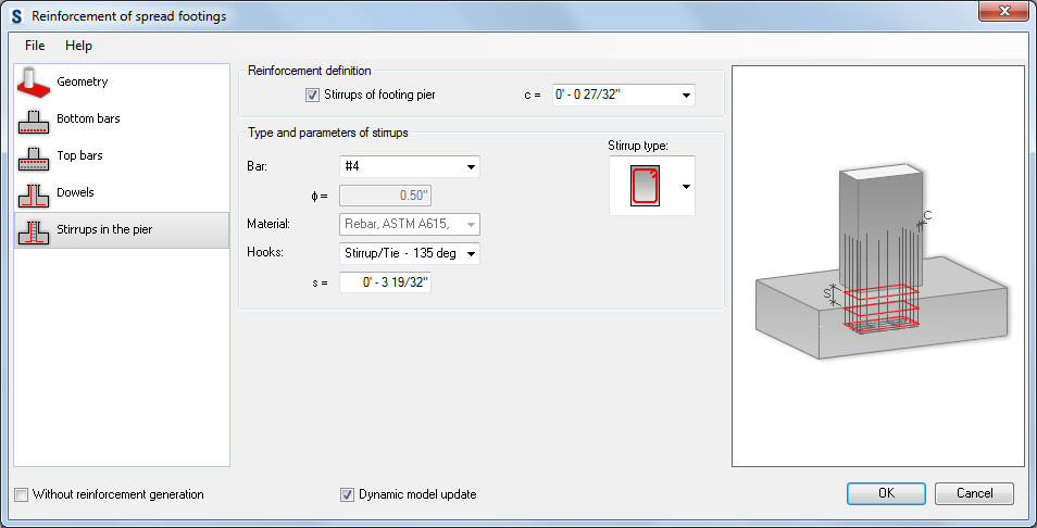 To generate stirrup reinforcement, under Reinforcement definition, select Stirrups of footing pier. You can then define parameters of stirrups:
