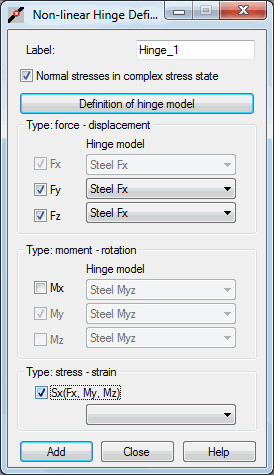 In the dialog, 3 non-linear hinge types are available: force-displacement, moment-rotation, and stress-strain. The stress-strain type is available after the Normal stresses in complex stress state option is selected. By default, all hinge types are cleared. For example, if the FY option is selected, the non-linear hinge models for that hinge type are available. Depending on the type of structure only some hinge types are available, similar to bar releases. The description in the Type: stress-strain field changes depending on the type of structure and the available degrees of freedom.