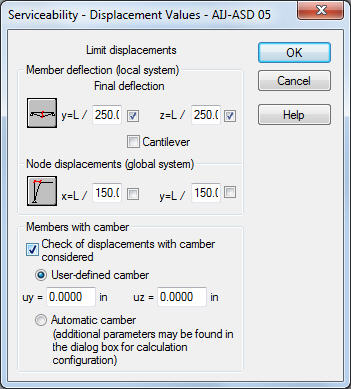 It is possible to define limit displacements (member deflection in the directions y and z, nodal displacements in the directions x and y) and additionally, to determine, whether a member is a cantilever while calculating member limit deflections.